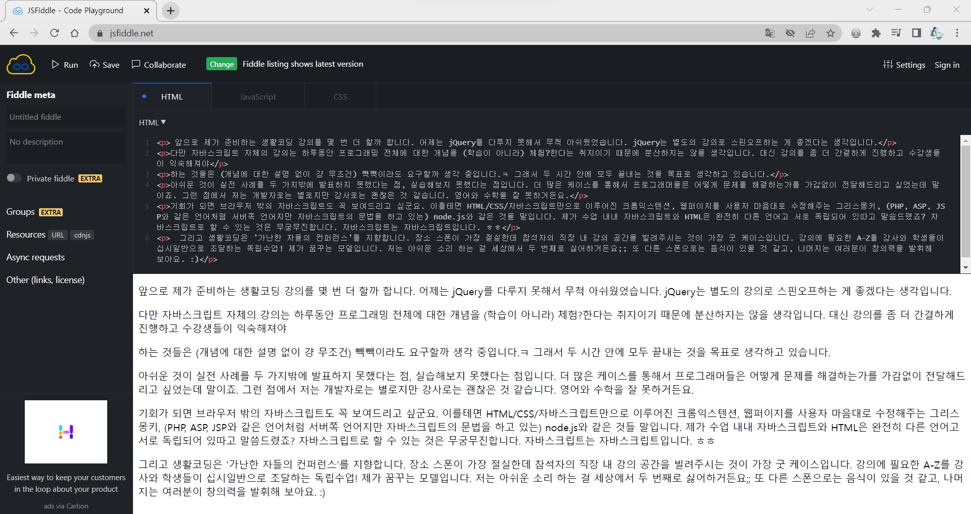<p>앞으로 제가 준비하는 생활코딩 강의를 몇 번 더 할까 합니다. 어제는 jQuery를 다루지 못해서 무척 아쉬웠었습니다. jQuery는 별도의 강의로 스핀오프하는 게 좋겠다는 생각입니다.</p>